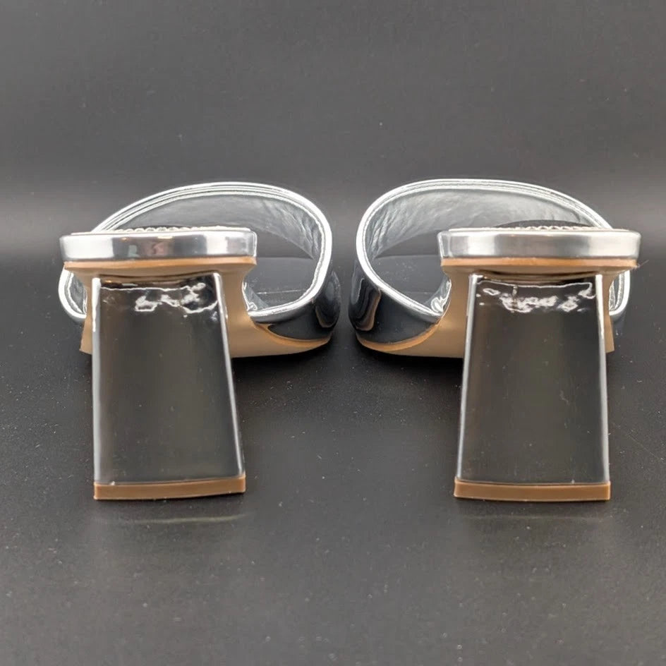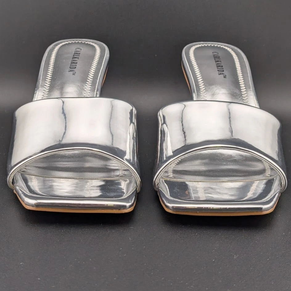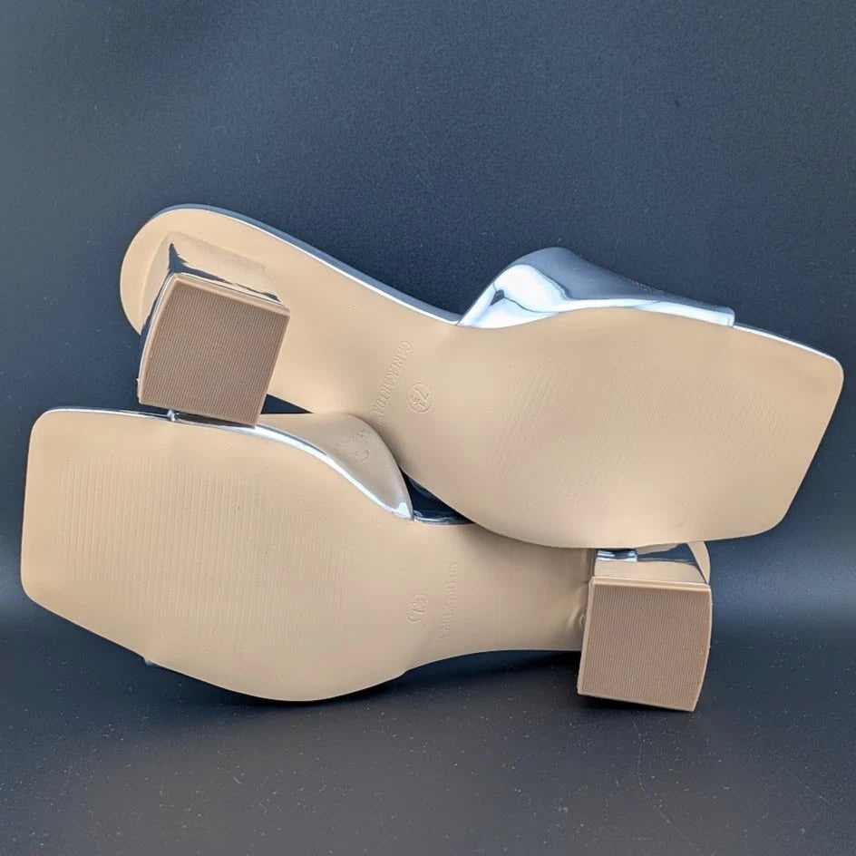 The Carl Karinda Size 7 & 7.5 Women's Silver Metallic Slip On Chunky Heeled Mules are a stylish and luxurious option for a variety of occasions. With a comfortable and non-slip synthetic outsole, faux leather lining, and chunky block heel, these sandals are perfect for travel, weddings, parties, casual outings, formal events, and workwear. The silver metallic color and 3.0" heel height add a touch of glamour, while the open toe design and solid pattern give them a timeless and elegant appeal. Made with gel insole material, these mules are sure to provide both comfort and style for the summer, fall, and spring seasons.