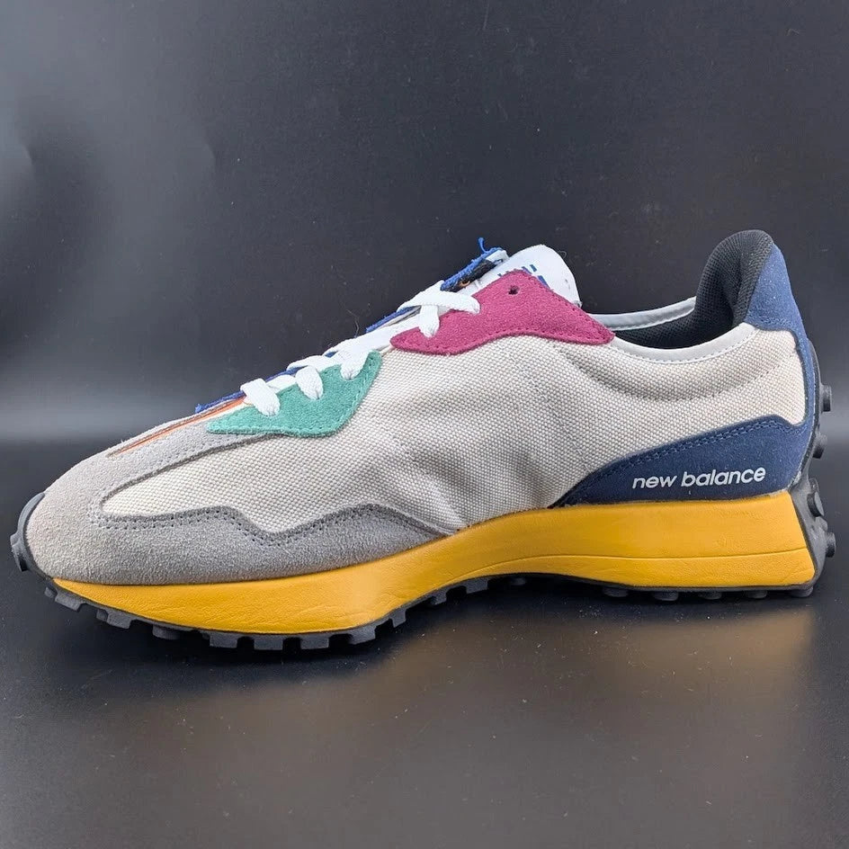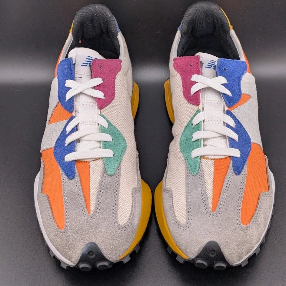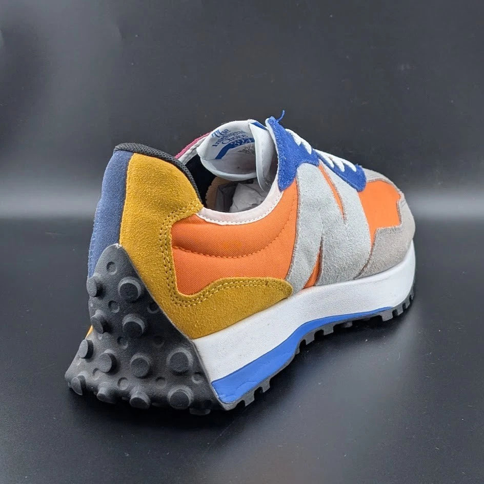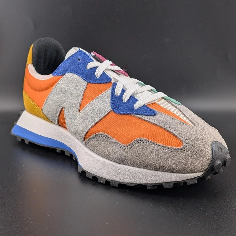 The Dejounte Murray New Balance 327 Shoes in Men's Size 11 feature a stylish design in Heat Up-Orange canvas and grey suede, with a low-top sneaker style. These athletic shoes offer comfort with features like cushioning and breathability, making them suitable for activewear occasions. With a rubber outsole and lace-up closure, these shoes offer stability and support for a range of activities, including gym training, running, and cross-training. The New Balance 327 model is part of the Cs7 product line and is a trendy choice for casual wear in all seasons.
