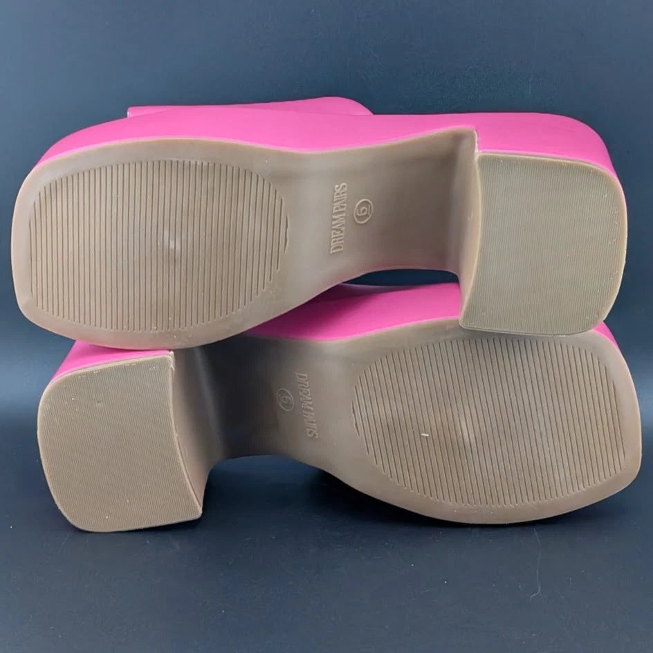 The DREAM PAIRS Size 6 Women's Platform Heels are stylish slip-on sandals in a vibrant hot pink color, featuring an open toe design and chunky block heel. These high heels are perfect for various occasions such as travel, weddings, parties, casual outings, formal events, and even workwear. With a comfortable gel insole and non-slip synthetic outsole, these sandals provide both style and functionality. Made with faux leather material, these modern sandals are designed for the fashion-forward woman looking to make a statement with her footwear choice.