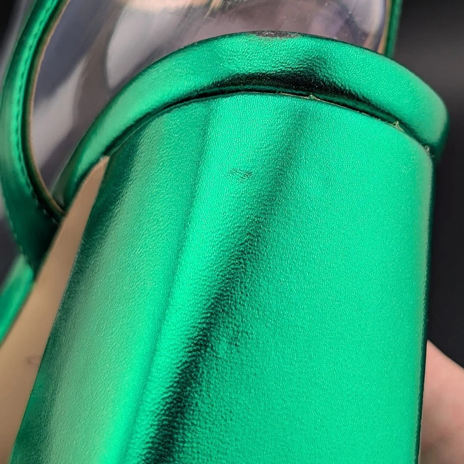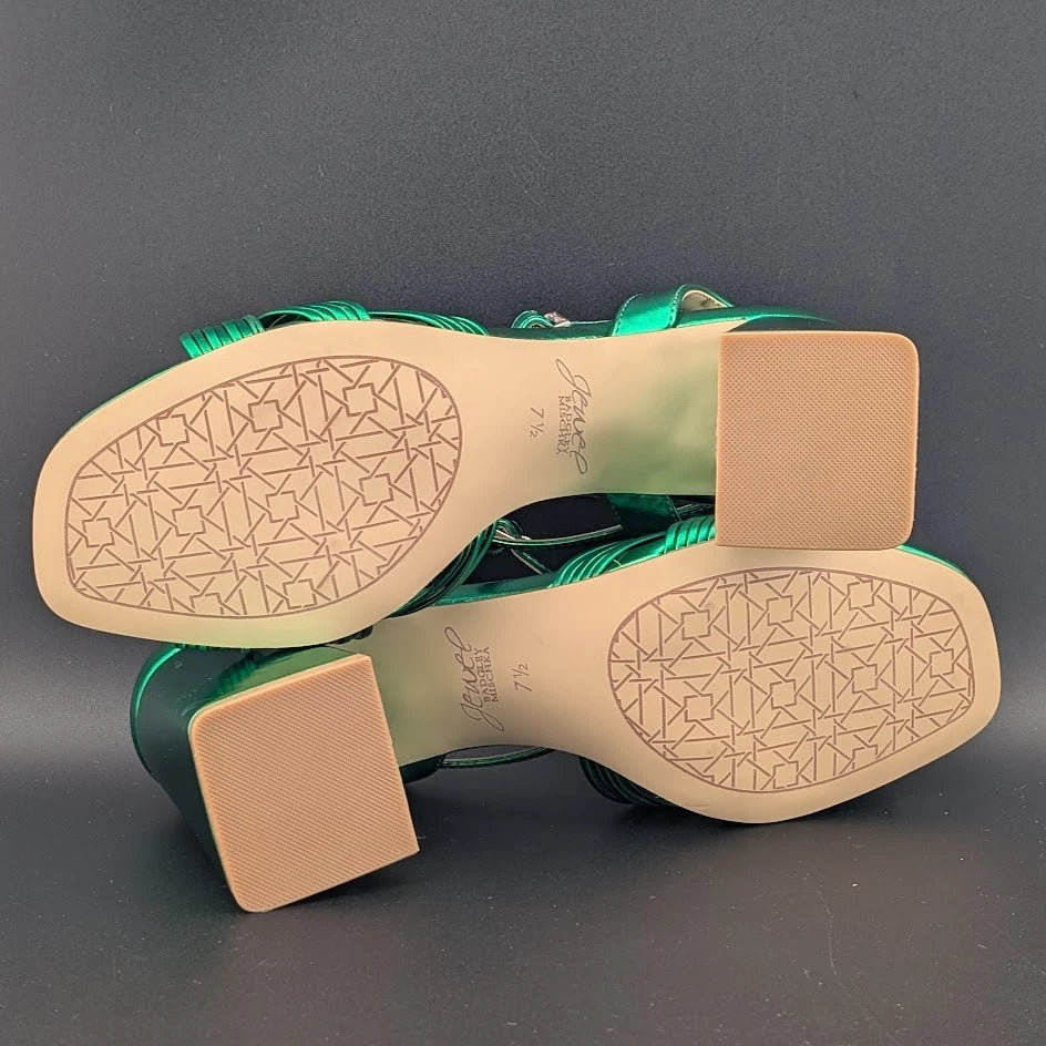 These Jewel Badgley Mischka size 7.5 Michelle ankle strap sandals are perfect for holiday parties or formal occasions. The green metallic color and strappy style add a touch of elegance to your outfit. With a 3.5" block heel and leather lining, these sandals are both stylish and comfortable. The ankle strap closure provides a secure fit, making them a great choice for any event. Made by the renowned brand Badgley Mischka, these shoes are a must-have addition to any woman's wardrobe.