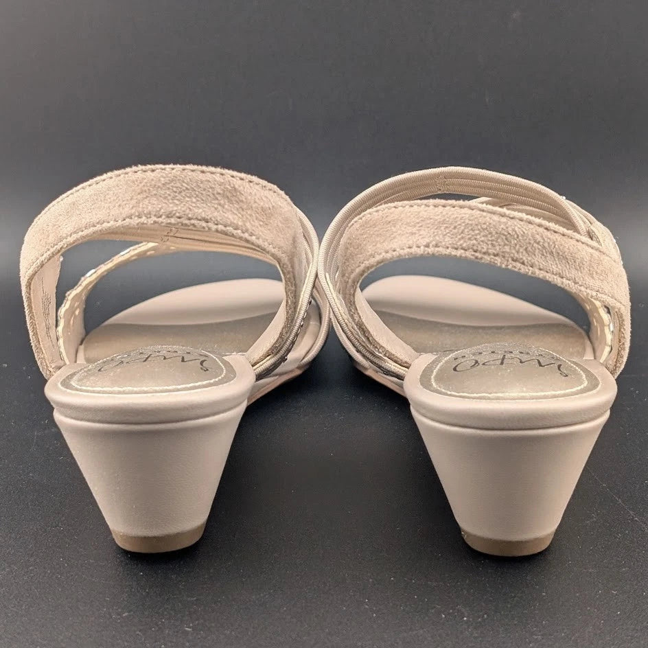 The NWB Women's Size 7M IMPO Gatrina Embellished Stretch Wedge Sandals in Praline are stylish and comfortable sandals perfect for casual occasions during the summer, fall, and spring seasons. These slip-on sandals feature a mid-height wedge heel with studded and rhinestone accents, adding a touch of flair to the solid praline color design. The stretch feature and memory foam insole provide a comfortable and personalized fit, making these sandals a versatile and fashionable choice for any woman's wardrobe.