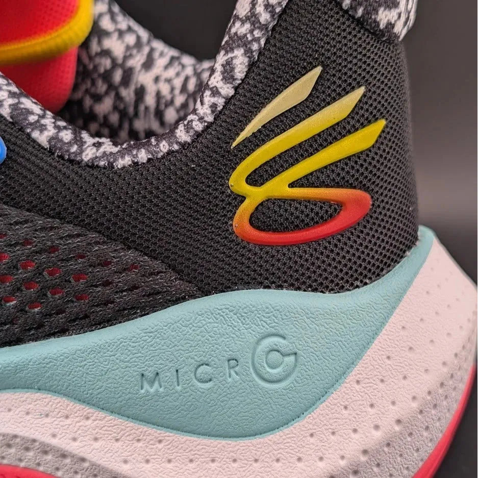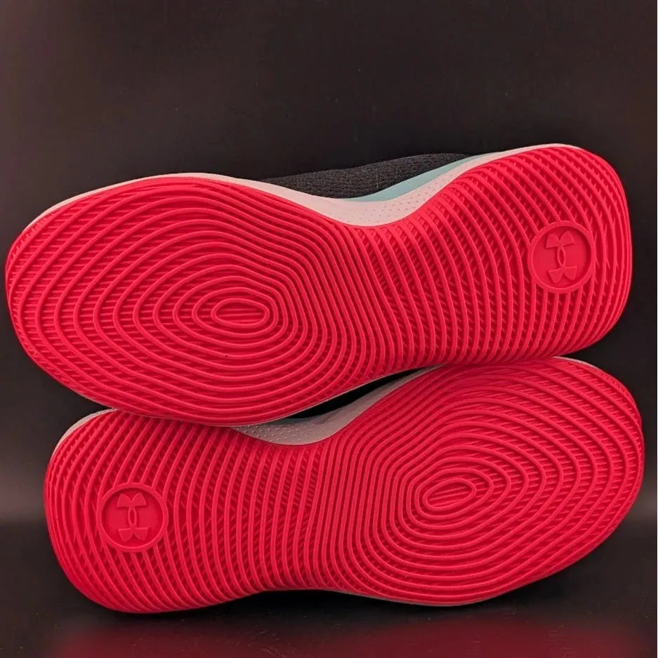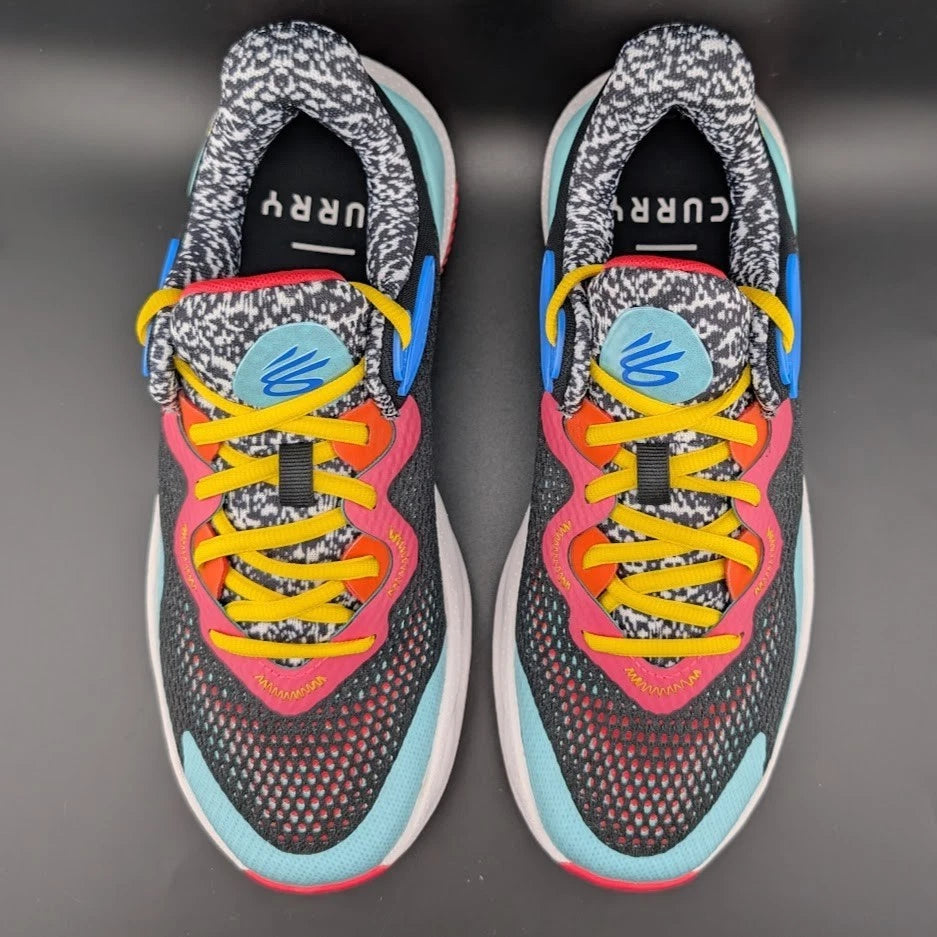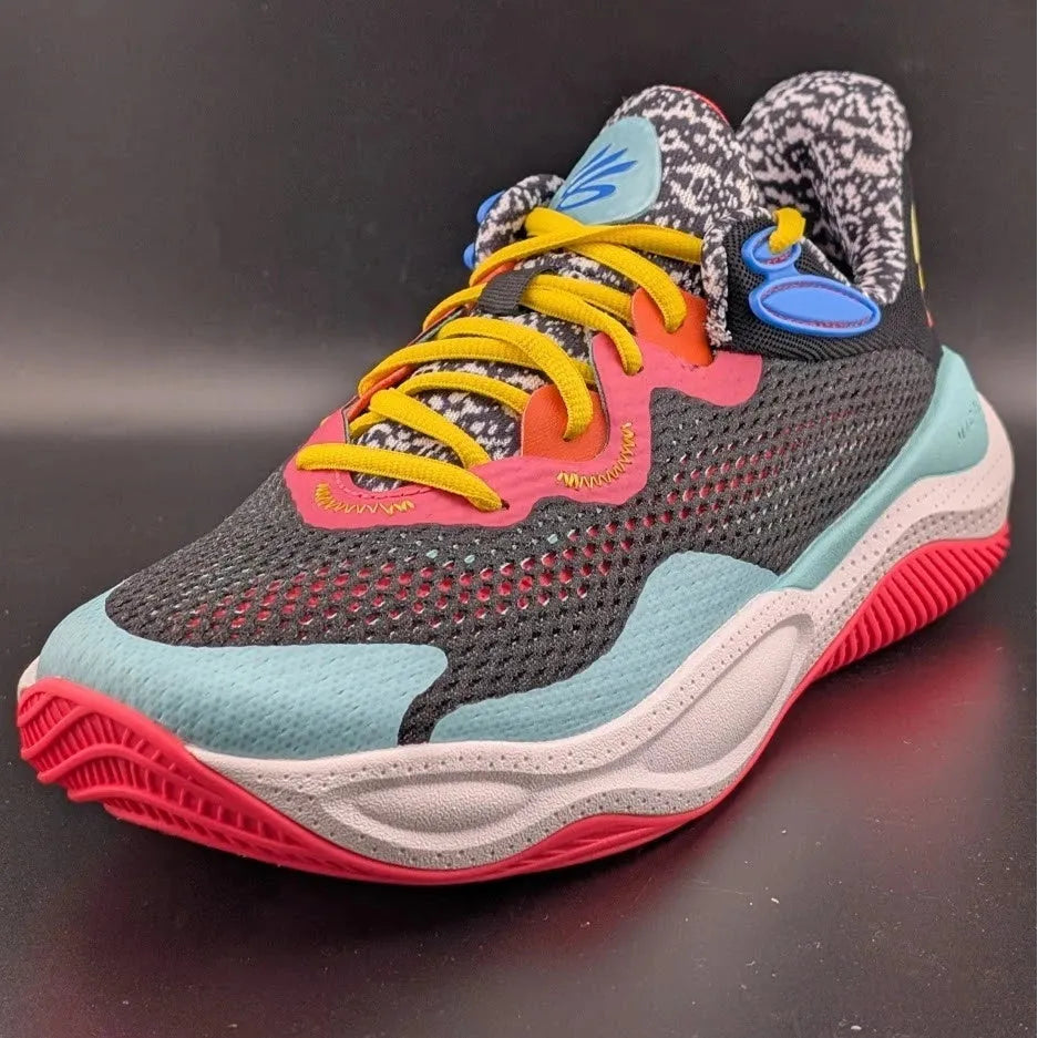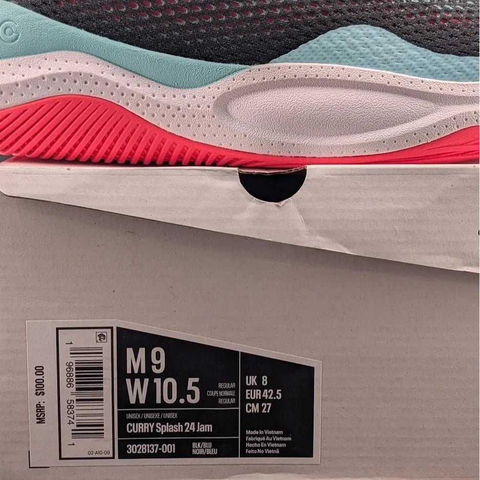 The Under Armour Curry Splash 24 Curry Jam Basketball Sneakers in Men's size 9 / Women's Size10.5 are a stylish and functional choice for any basketball enthusiast. These lace-up sneakers feature a colorblock design with black, turquoise, pink, orange, and yellow accents, showcasing the signature Curry style. With features like arch support, comfort, and breathability, these sneakers are perfect for all seasons and occasions, whether for casual wear or athletic activities. Made with a durable rubber outsole and synthetic lining, these sneakers are a quality product from Under Armour designed for performance on and off the court.