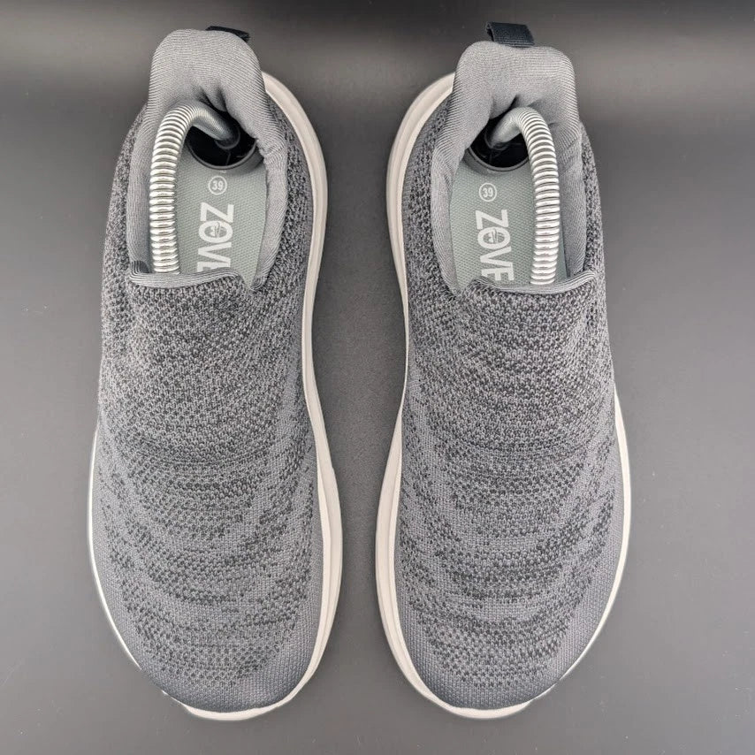 The Wide Toe Box Shoes Size 8W (EU 39) Women's Wide Width Ultra-Light Walking Shoes by Zove are designed for women who prioritize comfort and style in their footwear. These shoes are made of the same components as Skechers: Lightweight EVA Foam with mesh uppers and a removable footbed. While they are not the same shoe, they are not at the same price levels either. These slip-on sneakers feature a wide toe box for ample room and a lightweight EVA foam outsole for added cushioning. The mesh upper material and cushioned insole provide breathability and support for all-day wear, making them ideal for walking and other activewear occasions. With a sleek grey and white color combination and a solid pattern, these athletic shoes are perfect for the summer, fall, and spring seasons.