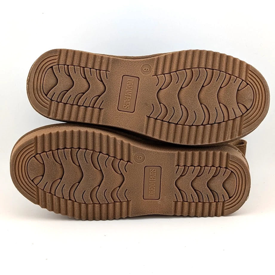 These Size 6 chestnut suede booties feature a faux fur lining for added warmth and comfort. Designed with a slip-on style, round toe shape, and low heel height, they are perfect for casual occasions and travel during the winter, fall, and spring seasons. The breathable and water-resistant outsole material ensures durability and a cozy fit, making them ideal for outdoor activities in cold weather. With a medium calf width and ankle shaft style, these boots by Dream Pairs are a stylish and practical addition to any woman's wardrobe.